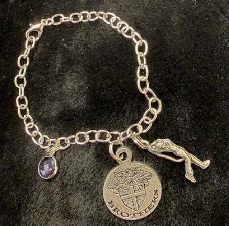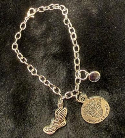This hand crafted chain link has a Traditional CBA crest charm in pewter with an elegant amethyst crystal dangle. Includes your choice of extra charm.