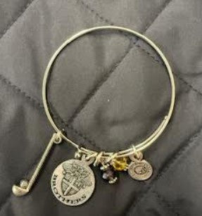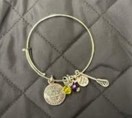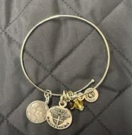 This hand crafted bangle has a Traditional CBA crest charm with an elegant crystal dangle. Includes your choice of extra charm.